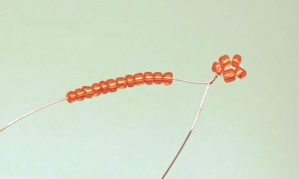 Вторая петля будет располагаться на коротком конце проволоки. Наберите 12 бисеринок.