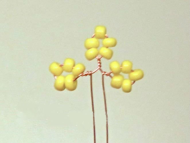 Затяните проволоку так: бисеринки желтого цвета должны образовывать третью петлю над двумя предыдущими петлями. Теперь скрутите остатки проволоки между собой.