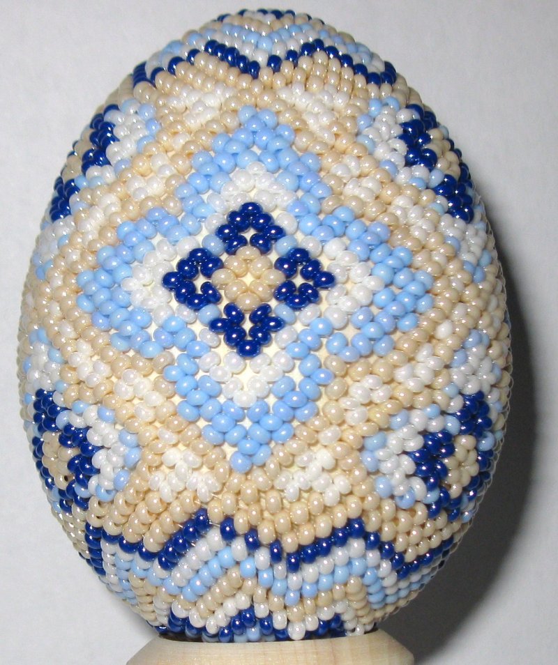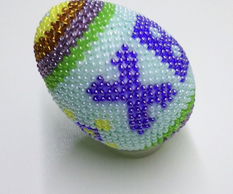 Затем далее проплести по яйцу постепенно расширяя диаметр, важно соблюдать цветовое сочетание в рядах. Важно заранее отметить на яйце места для букв и выделить их с помощью другого цвета.