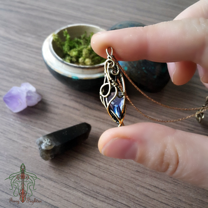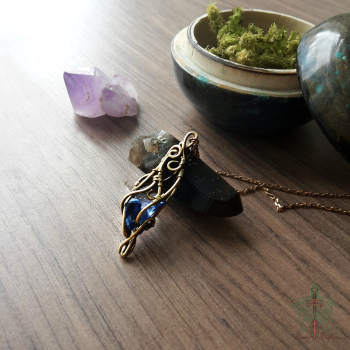 Изящный и одновременно хищный кулон выполнен из латуни без применения пайки. Центром композиции стал крупный яркого-голубой фианит необычной огранки. Цепочка машинного плетения, тоже полностью латунная, а это значит, что она не “облезет”, и ее всегда можно будет почистить или отполировать, не боясь повредить покрытие.