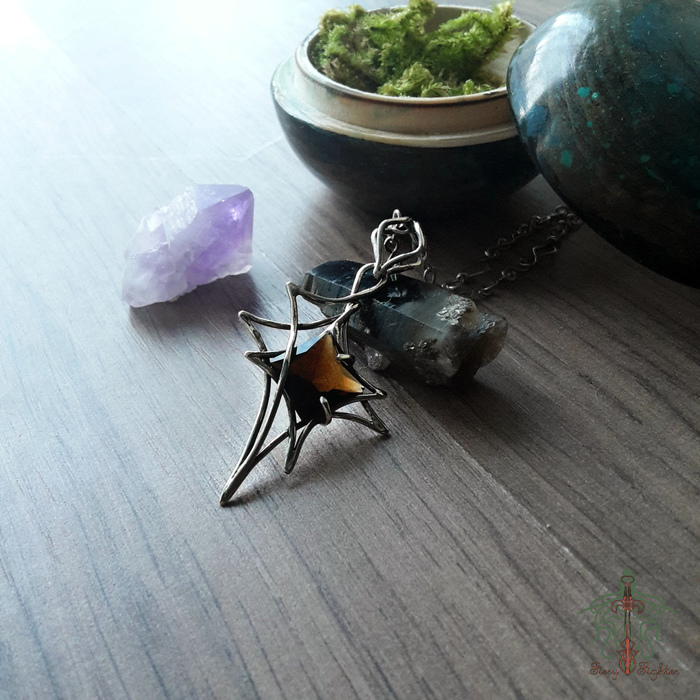 Довольно крупный кулон из серебристого нейзильбера выполнен в форме асимметричной звезды с острыми углами-лучиками. В центре темно-коричневый, словно остывающий уголек, алпанит, который кажется то красноватым, то совсем черным в зависимости от освещения. Цепочка так же сплетена вручную, с декоративными звеньями в виде ромбов, чтобы гармонировала с кулоном. Все патинировано и тщательно отполировано.