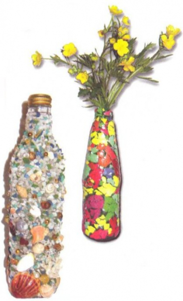 Декор бутылок и ваз различными способами и материалами подразумевает использование природных материалов, таких как ракушки. В основном, такую технику используют в морском стиле. Для создания такого украшения поверхность обезжиривают и наносят на нее клей. Сначала декорируют тару нитками, а затем на нитки приклеивают ракушки и другие элементы морской тематики.