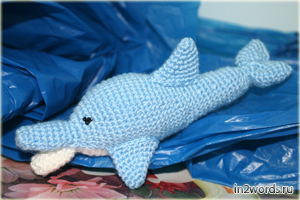 Нити оторвать с длинными концами и использовать для завершения хвоста. Игрушечного вязанного дельфина плотно набить синтепоном, оставив хвост пустым.