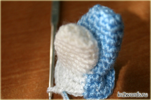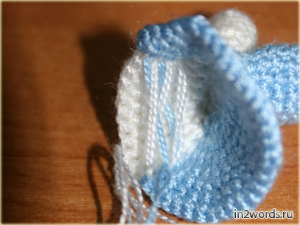 Верхний пришиваем по центру голубой стороны, примерно на расстоянии 24-25 рядов от “носа”. Также немного расширяя края, между ними должно быть около 2-3 петель. взято с https://www.in2words.ru