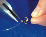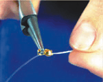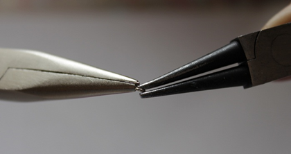 Леску нужно продеть в отверстие калотта и завязать несколько узелков. На этот узел надеть кримп-зажимную бусину и сдавить её при помощи плокогубцев. После этого калотт закрыть и со стороны петельки отрезать лишнюю леску. К ушку при помощи кольца прикрепляется замок. Та же операция проделывается по завершению изделия с другой стороны, но к ушку зажима крепится кольцо или кусочек цепочки с украшением на конце для регулировки длины.