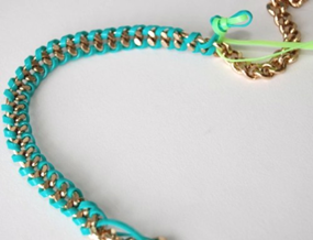 Очень красивый и в то же самое время нетрудный в исполнении браслет получается из цепочек и лент, которые переплетаются в звеньях цепочки.
