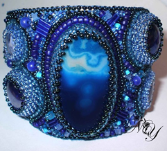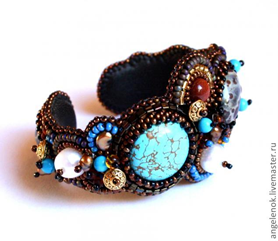 Также самые простые металлические браслеты используются как основы для приклеивания вышивок из бисера. Это направление в handmade – целое искусство, которое требует терпения и усидчивости мастера. Обычно это делается так: по задуманному эскизу на кусочек фетра приклеиваются кабошоны, которые потом обшиваются бисером, в итоге получается целый узор из бисера, который в результате вырезается и приклеивается на кусочек кожи, который в дальнейшем опять же приклеивают к металлическим основам. Сразу освоить этот вид мастерства не так легко, требуется время и опыт. В результате получаются вот такие красивые, сказочные украшения.