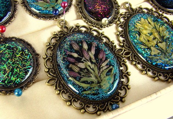 Я делаю из них кулоны, но можно и серьги. Изделия на их основе получаются визуально легкими и стильными за счет прозрачности эпоксидной смолы.