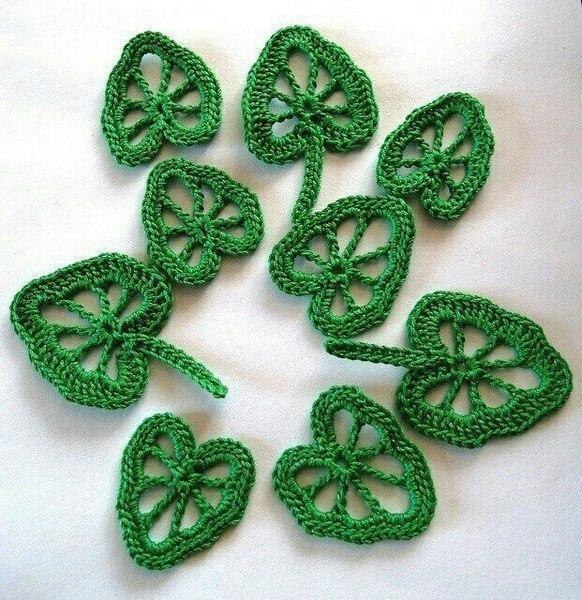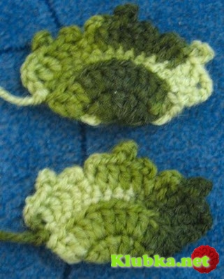 Вязать их зеленой нитью. Набрать в круг 12 петелек. Затем в следующем ряду в каждый столбец сделать по два штуки ст с/н. Всего 24 пет. Сложить деталь пополам и за задние стенки петелек соединить края лапки следующим образом – 1 стбн. 2 стбн в одну петлю. На следующем круге сделать 3 в.п. 2 один СН, пико, 2 Ст. с нак. 3 возд пет соединительным столбиком присоединить к последующей петле основания. Повторить рисунок 3 раза.