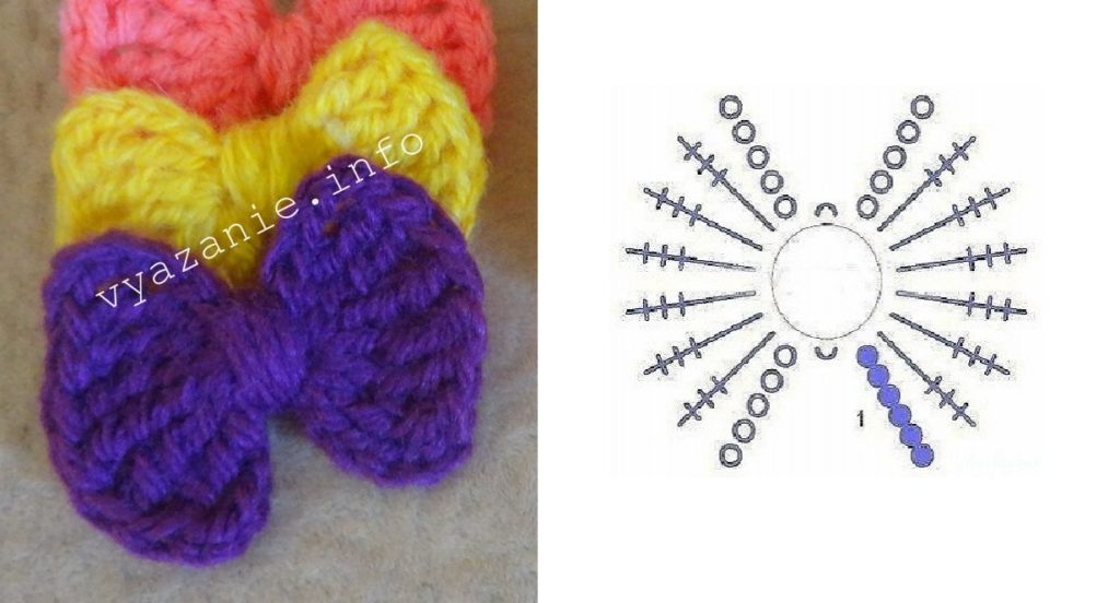 Начинается не из готовой серединки, а вокруг цепочки из воздушных петель, которая только после окончания работы соединяется в круг. Лепесток — это набранные вверх от центра воздушные петли, в каждую из которых провязан соединительный столбик по направлению вниз. Количество петель и лепестков не ограничено. После необходимо изделие расправить как лучики.