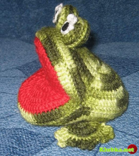 Чтобы сделать такого лягушонка, нам необходима пряжа болотного и алого цветов, вязальный крючок и синтепух, вата или холлофайбер.