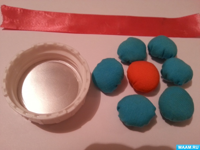 Материал: пластиковая крышка от бутылки, ткань, наполнитель, клей, ножницы, тесьма, нитки, шаблон.