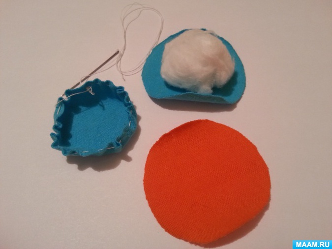 И теперь набиваем саму чашечку синтепоном. И пришиваем сверху наш получившийся кружочек. Пришивать нужно так, чтобы швов не было сильно видно.