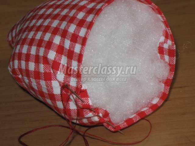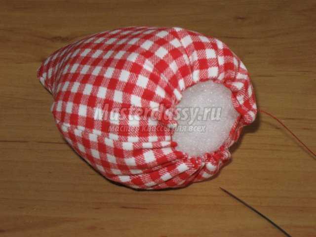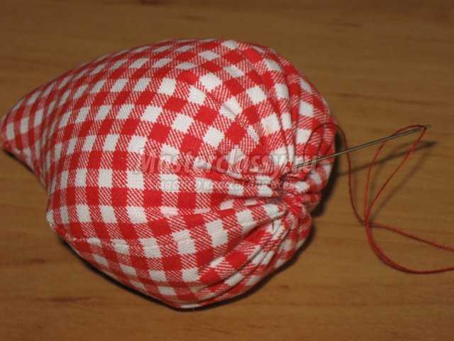 Далее получившуюся конструкцию вставляем в верхнее отверстие нашей клубнички и пришиваем вручную, подтягивая и расправляя. Завязываем последний узелок. И наслаждаемся содеянным.