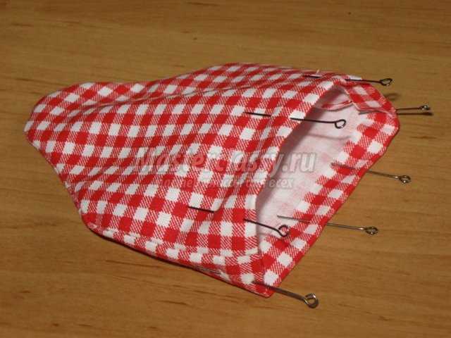 Открытый срез подворачиваем на 1см внутрь. Булавками прикалываем подгибку.