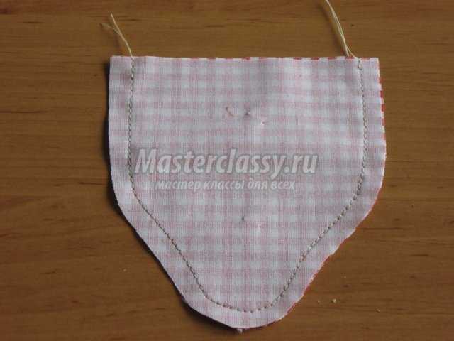 Выворачиваем нашу клубничку, берем нитку с иголкой и собираем по верхнему краю простым швом вперед иголку. Мельчить не надо, длины стежка 0,5 см будет достаточно. Нить не обрезаем.