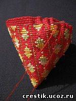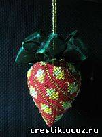 Конус готов и начинаем формировать клубничку . Мелкими стежками начинаем нанизывать и стягивать основание. Из-за маленького припуска мне пришлось нанизывать почти впритык к вышивке. А вообще я бы советовала, у кого оставлен хороший припуск, нанизывать, отступая от края приблизительно 0,5 см, тогда часть вышивки не спрячется в складочках и под бантом или листочками. Стягиваем ниточку и набиваем клубничку. Когда набивки достаточно, стягиваем до конца и хорошо закрепляем ниточку. Верх клубнички украшаем бантом, фетровыми, вязаными листочками итп. Украшаем так, как подскажет ваша фантазия. Подвеску можно сделать из ленточки бисера жгутика и т. д.