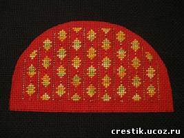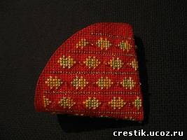 Я вышивала на канве красная аида 14, мультиколор Анкор 1304, золотой металлик, чешский бисер золотой 17050. Если вы вышиваете по готовому дизайну, то оставляйте большой припуск для сшивания. Приблизительно 1-1,5 см (на фото я оставила маленький припуск, просто изначально не поняла для чего нужен побольше). Если канва очень осыпается, то пройдитесь по краю полукруга клеем ПВА.