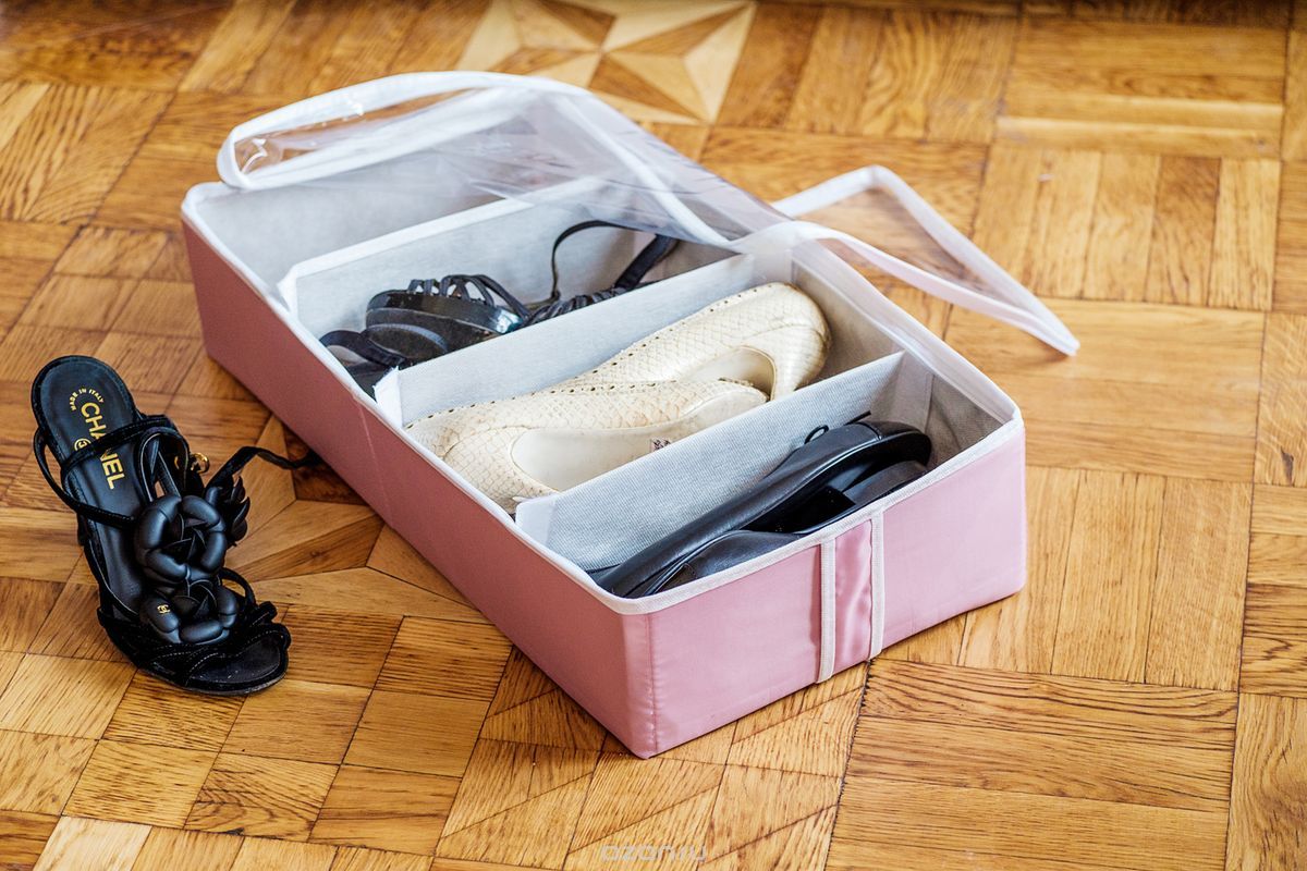 Хранение в картонных коробках, в которых изначально приобреталась обувь. Если их не осталось, то обувные коробки можно приобрести в любом специализированном магазине или заказать через интернет.- Специальные органайзеры, оснащённые множеством различных отделений. В таком месте можно держать одновременно несколько различных типов обуви. Основное преимущество в том, что органайзер имеет превосходную циркуляцию воздуха за счёт специального материала изготовления.