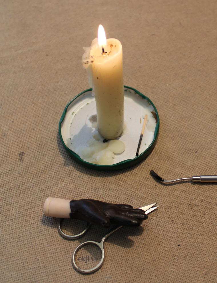 Ручка одета, но у нас неаккуратны швы. Опять поджигаем свечу. В дело снова металлический стек. Приглаживаю шов, опять нагреваю и снова приглаживаю. Если в замысле вашей работы манжета нет. Перчатка готова!