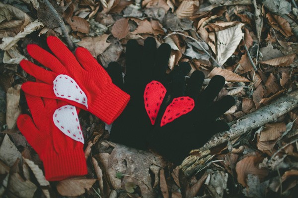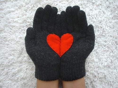 Самый простой способ — пришить (приклеить) фетр или ткань в виде интересной фигурки на варежки. Сердечки простой и подходящий вариант для девушек.