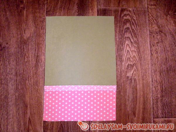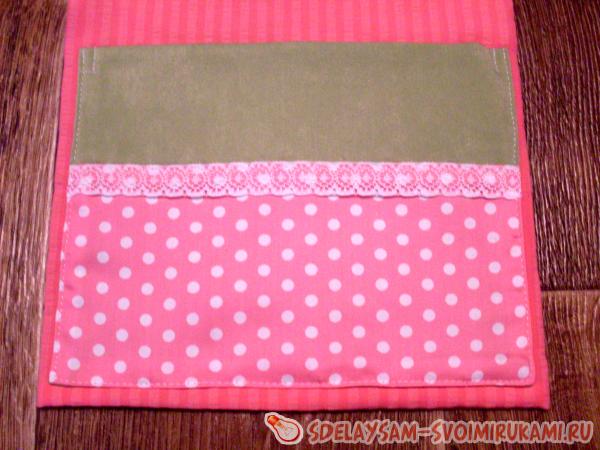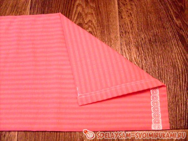 Части кармашка следует сшить между собой швом шириной 1 см по стороне длиной 26,5 см. Припуск шва нужно заутюжить в сторону розовой ткани, поверх шва стачивания частей надо нашить кружево.