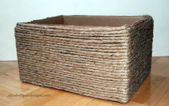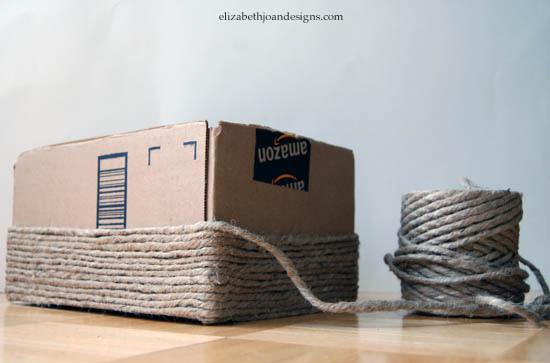 Затем вокруг коробки наматывайте веревку. В процессе работы, нужно приклеивать каждую часть жгута.