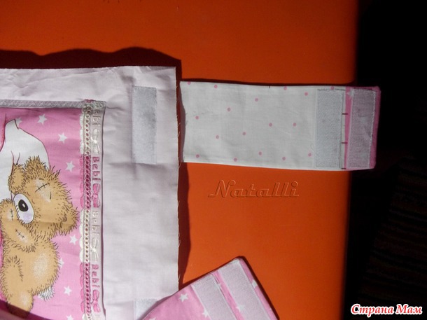8. На кроватке примеряем расположение шлевок, отмечаем, и в этих местах на лицевой части пришиваем мягкую сторону липучки ( такой же длины, у нас 7.5см) немного отступив от верхнего края
