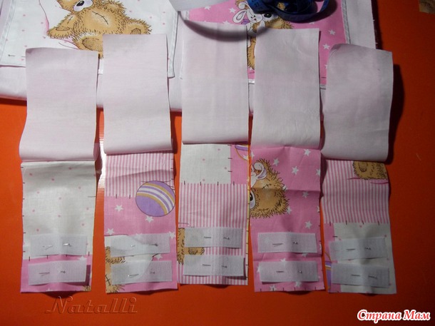 # т. к. тика немного не хватило на выбранную мной ширину, на изнаночную сторону я поставила кусочки бязи, изначально я сделала 5 заготовок – в итоге понадобилось только 4шт.