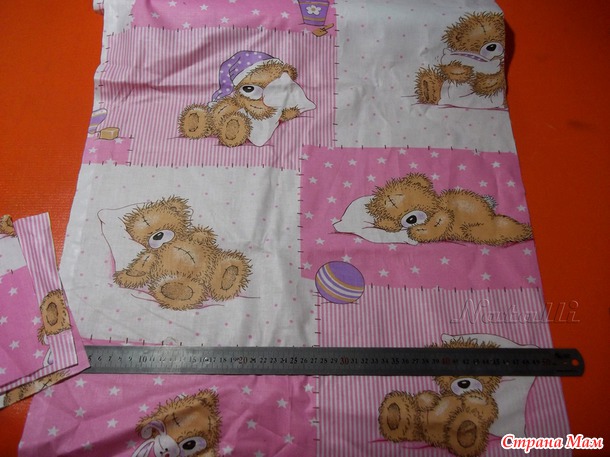 Недавно сшив на заказ комплект постельного белья для детской кроватки – из-из расположения рисунка, остался довольно большой кусок бязи с интересным мишками Тедди)