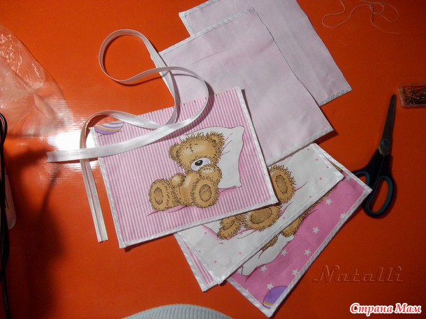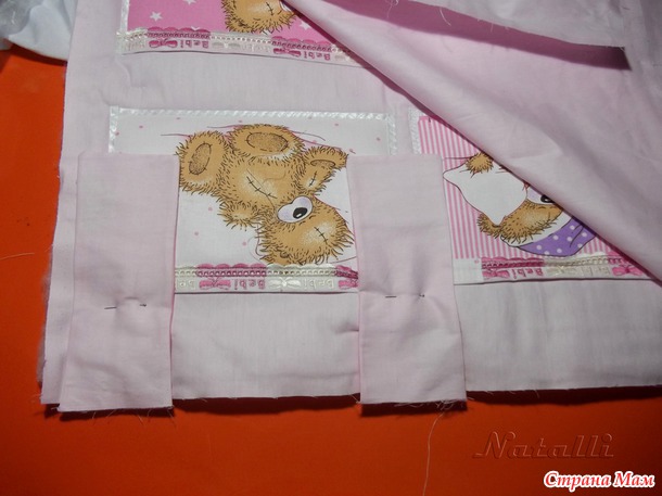 1. Чтобы карманы получились более плотными, их нужно продублировать основной тканью. Для этого булавками прикалываем прямоугольники с мишками к тику и вырезала по краю