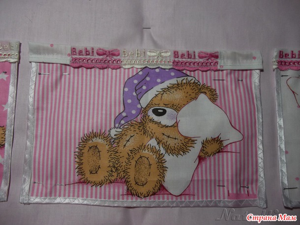 Я решила попробовать сшить органайзер для детской кроватки – эдакие кармашки для мелочей. Во-первых чтоб не лежал остаток ткани, во- вторых с целью тренировки перед пошивом приданного для своего малыша ( ждем сына поэтому розовые тона для нас не актуальны – хотя я бы с радостью оставила и этот себе)