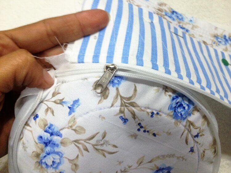 Разъединяем молнию. Прикалываем булавками половину молнии к крышке сумки. Прошиваем на расстоянии от края 1 см. Сверху накладываем подкладку лицевой вверх и пристрачиваем, загибая вовнутрь лишний припуск.