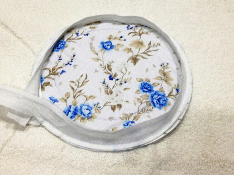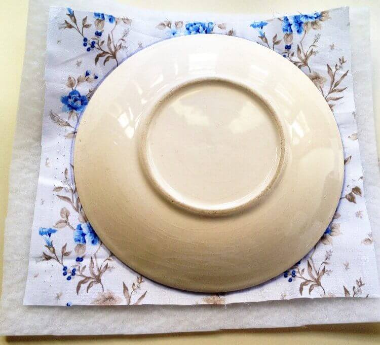 Нам понадобится несколько тарелок или мисок для выкройки донышка и верха сумки-органайзера. Подбираем тарелку с диаметром 18 см. Накладываем тарелку на ткань (в нашем случае — ткань в цветочек), обводим карандашом. Откладываем ещё 1 см. на припуск и вырезаем 2 такие детали. Проще кроить вместе с поролоном.