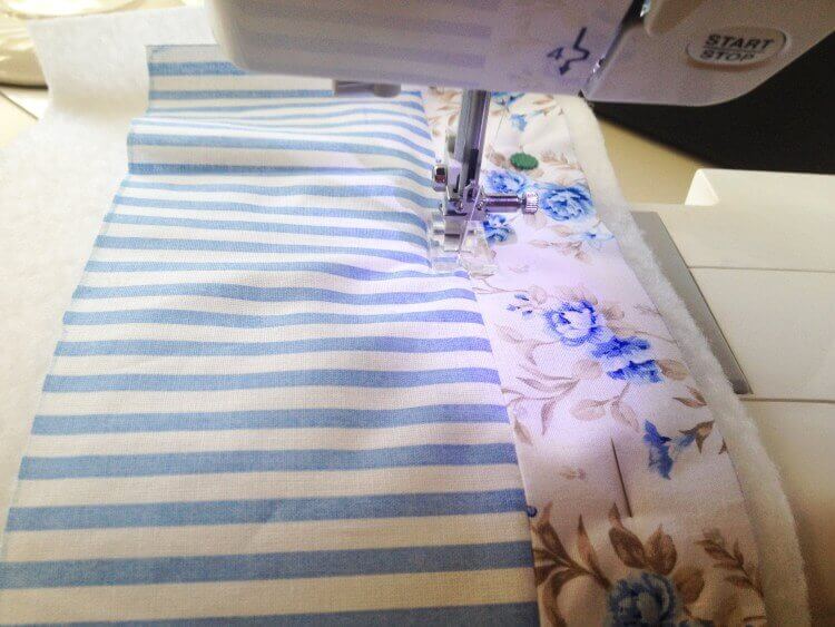 Сверху на основу нужно наложить прокладку из нетканого материала, уровняв с любой поперечной стороной, и проложить скрепляющую строчку швом шириной 1 см.