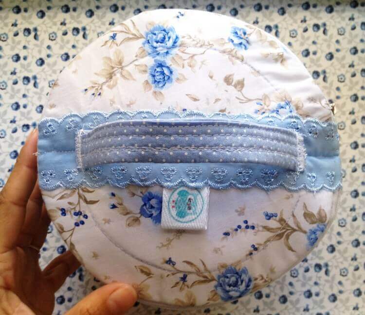 Прикладываем кружево, закалываем булавками. Отмеряем одинаковое расстояние от краёв крышки. Пришиваем ручку, сделанную и прошитую несколько раз.