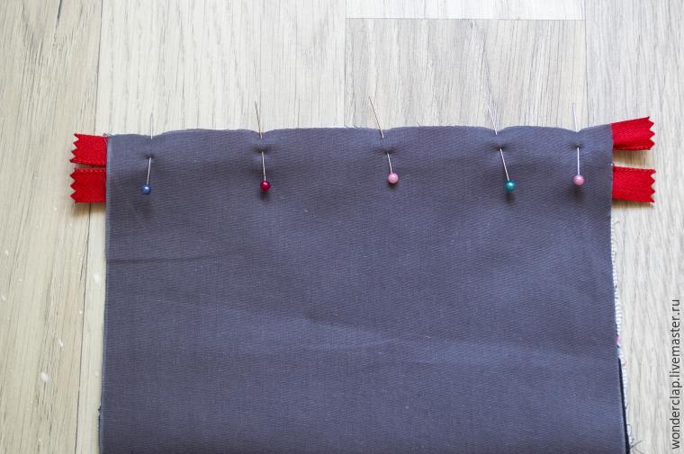 7. Сложите детали подкладки и основной ткани лицом к лицу и поместите между ними молнию, как показано на фото. Сколите булавками.