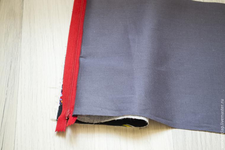 Со второй деталью делаем тоже самое, что и с первой. Берём молнию, несколькими стежками закрепляем концы. Взять небольшой кусочек основной ткани, и утюжить так, как видим на фото: