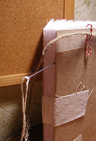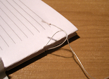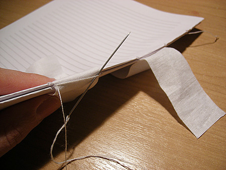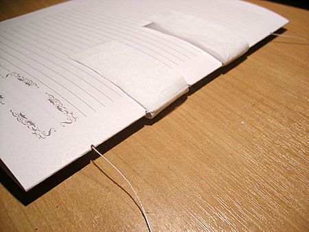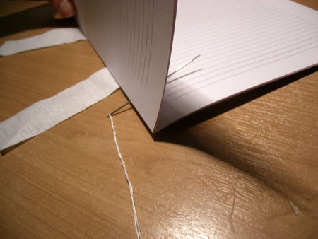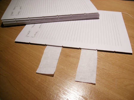 Они необходимы для скрепления листов между их форзацами. Когда доходите до ткани, нитку прошиваем сверху, а не снизу.