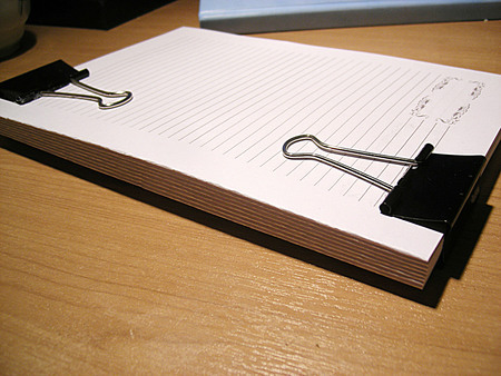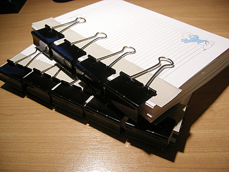 - Зафиксируйте стопку при помощи клипс, не забыв подложить под зажимы кусочек линейки, дабы избежать оставления следов от них.