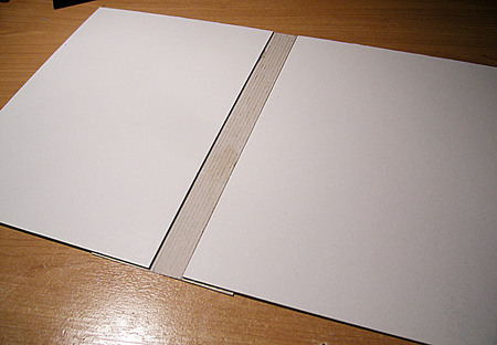 Основу под обложку следует делать из картона и офисной бумаги. Картонная основа состоит из 3-х частей, бумага — из одной широкой полосы, которая соединяет эти 3 части. На рисунке серым выделена бумага (часть корешка лежит на ней сверху). Между картонными составляющими около 2−3 мм промежутка.