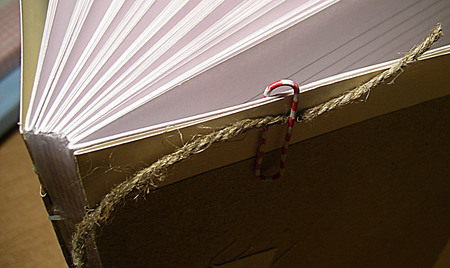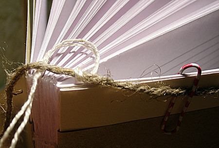 - В первых пяти листах нужно отыскать середину и закрепить там скрепку. Со стороны обложки в неё продевается веревка.