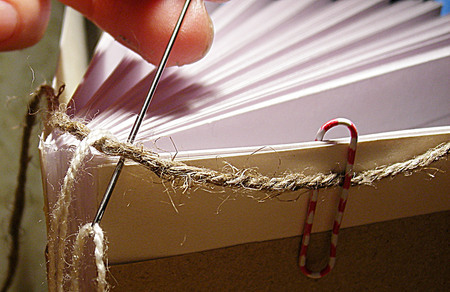 - В иголку вставляется одна льняная нить. Её длина напрямую зависит от количества будущих страниц, так как одной должно хватить на все сразу.