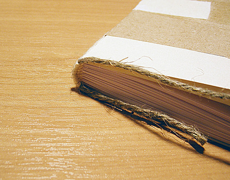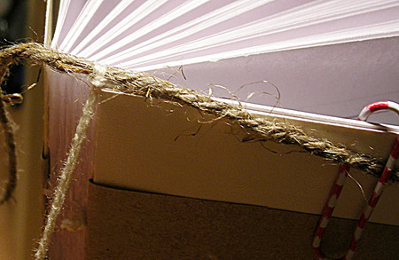 После того, как будут готовы пропилы, настанет время для сшивания страниц. Для этого потребуются легкие тканевые полоски, шириной примерно три сантиметра (как расстояние между пропилами). Также нужны прочные нитки. Лучше всего подойдут льняные, так как они ещё и достаточно тонкие.
