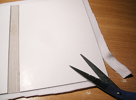 - Затем полоска промазывается сверху, на неё приклеивается лист картона. С наружной стороны прикрепляются тканевые полоски.