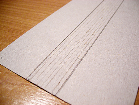 - С помощью шила нужно выдавить полосы на таком расстоянии друг от друга. Внутри проделываются таким же образом ещё несколько полос. Должно получиться как на фото ниже. Это нужно для того, чтобы блокнот легко сгибался.