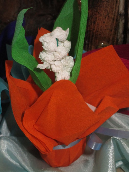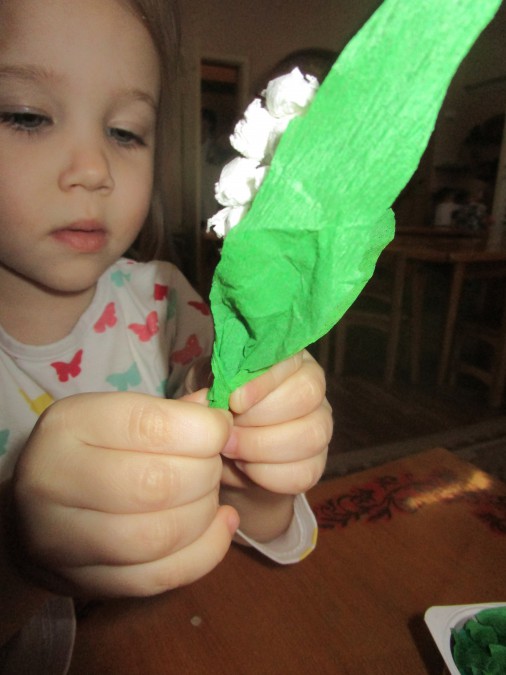 Сделали листики из зеленой гофрированной бумаги. Приклеили листики к стебельку ландыша.