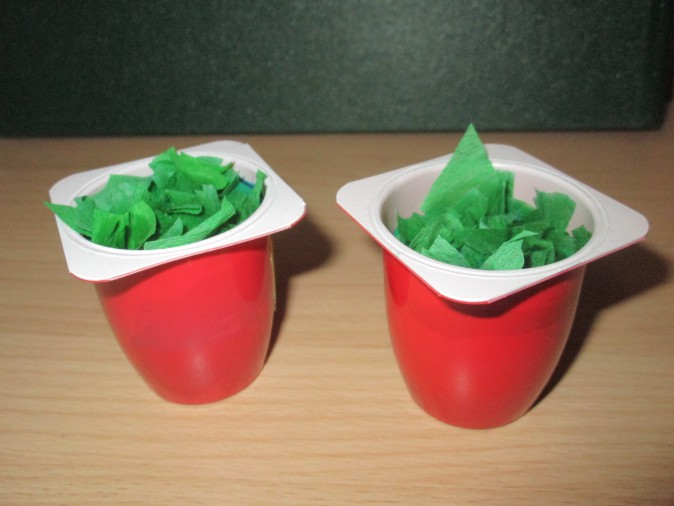В начале нашей работы, мы взяли, стаканчик, из под йогурта, и положили туда пластилин. Сверху, используя гофрированную зеленую бумагу, сделали в стаканчике травку, методом торцевания.