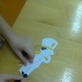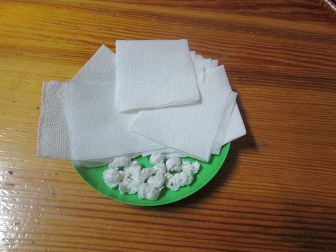 Затем приступили к скатыванию салфеток. Для этого брали белые салфетки, порезанные на квадратики примерно размером 6 на 6 см. и делали из них бутончики ландыша.