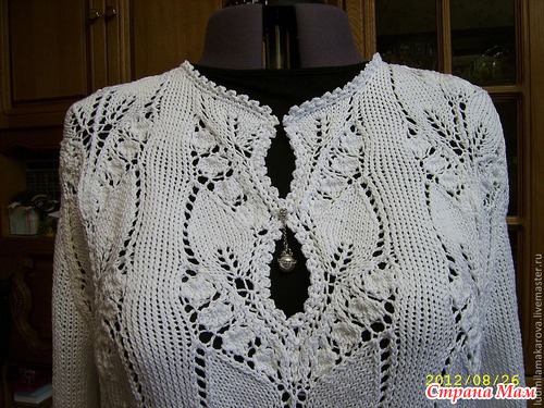 Вам потребуется: 300 (350) 400 г белой пряжи Linie 28 (60% хлопка, 40% вискозы, 120 м/50 г); спицы № 3,5; крючок №3.